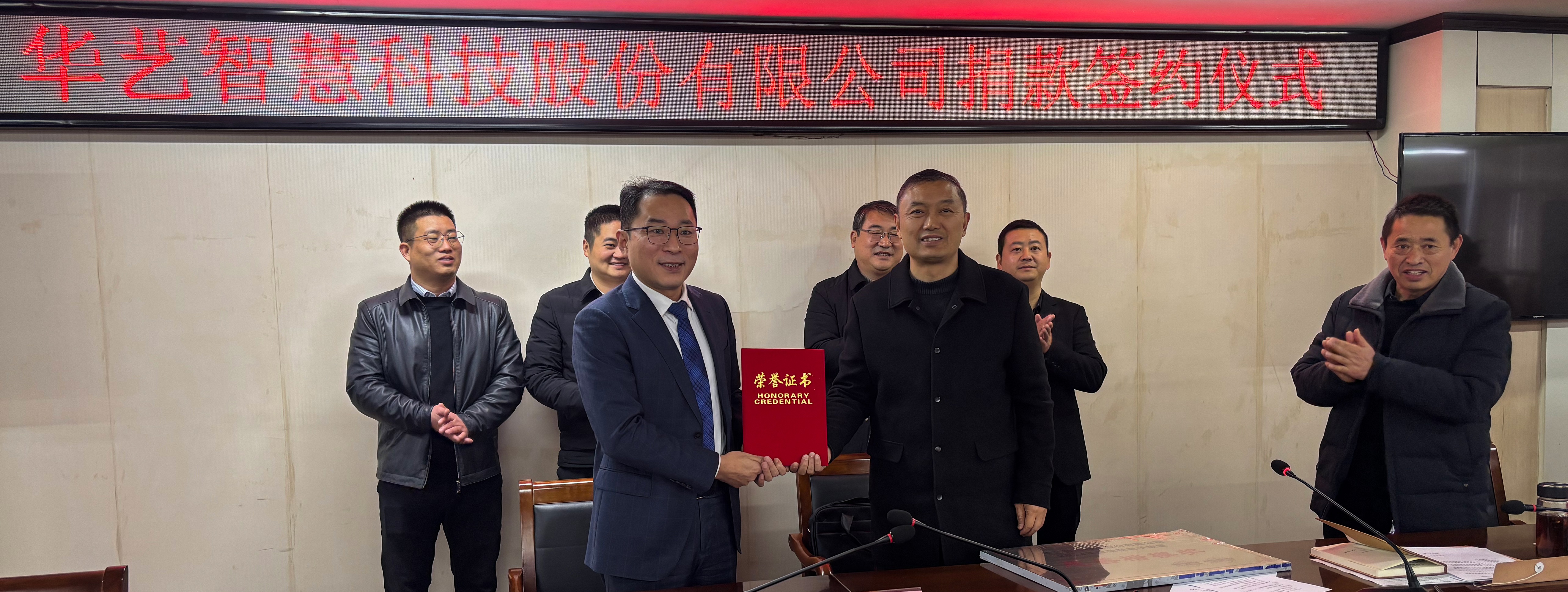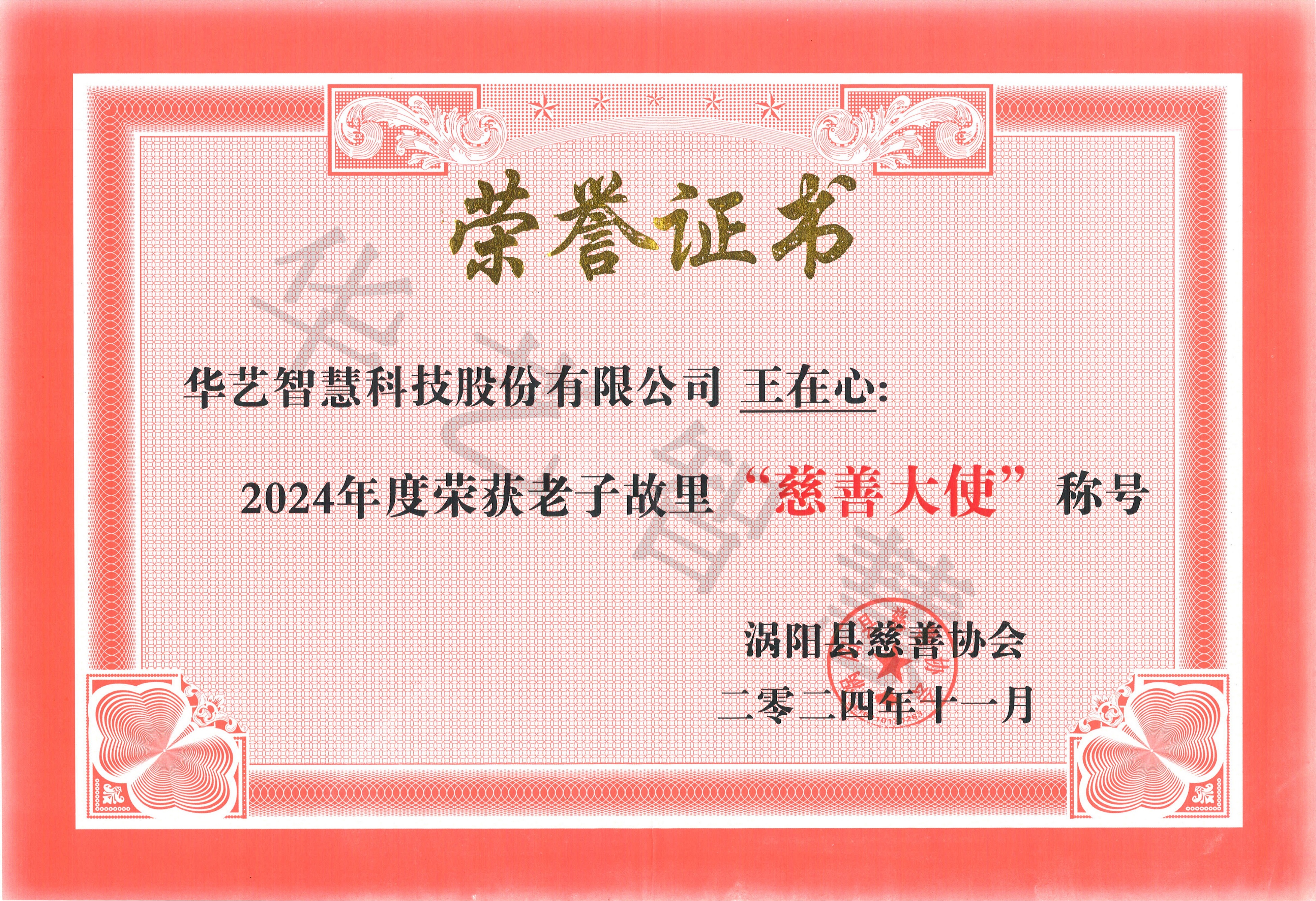 2024年12月4日,華藝智慧科技股份有限公司向渦陽縣慈善協(xié)會捐款簽約頒獎儀式在縣人大六樓會議室隆重舉行??h人大常委會主任劉峰、縣民政局黨組書記、局長翟保明、曹市鎮(zhèn)黨委書記張兵、華藝智慧科技股份有限公司總裁王在心、皖北區(qū)域總經(jīng)理金鵬飛、縣慈善協(xié)會秘書長李洪全等有關(guān)人員參加了簽約、捐款、頒獎儀式。華藝智慧榮獲老子故里“慈善楷模獎”,華藝智慧總裁王在心榮獲老子故里“慈善大使”稱號。