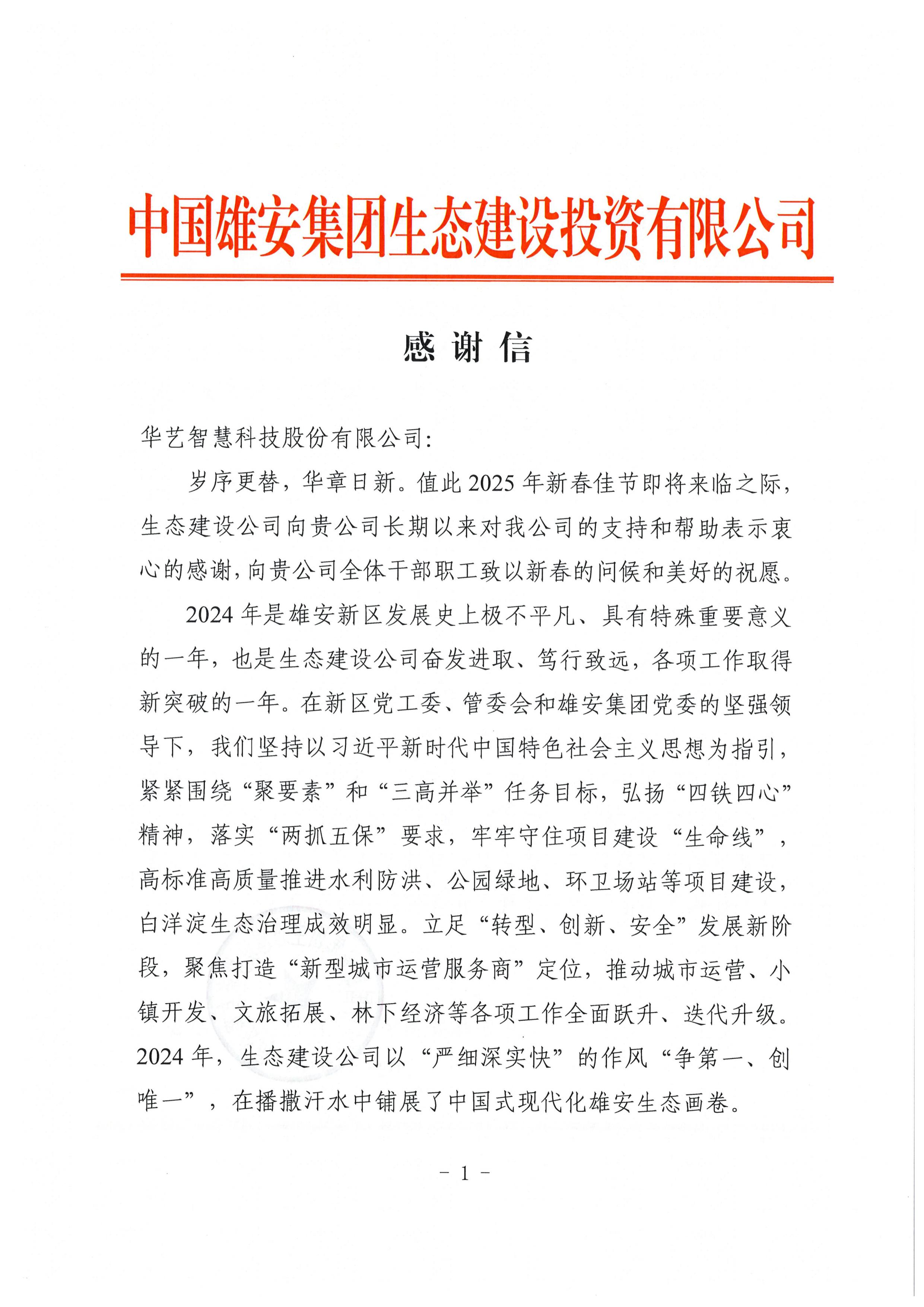 一封感謝信,讓全體華藝人倍受鼓舞,不僅是對華藝智慧卓越管理和匠心營造創(chuàng)新生態(tài)環(huán)境產(chǎn)品的充分肯定,更是一份沉甸甸的責任。華藝智慧將以此為契機,以更加飽滿的熱情、更專業(yè)的能力、更高效的服務(wù),回饋這份彌足珍貴的信賴與支持。華藝智慧作為地球生態(tài)圈(大氣圈、水圈、巖石土壤圈、生物圈)的美麗健康保護者和智慧科技運營商,專注做地球生態(tài)圈的研發(fā)、規(guī)劃、設(shè)計、保護、建設(shè)、運營、投資、管理等一體化系統(tǒng)解決方案,按照“產(chǎn)品+內(nèi)容+生態(tài)+科技”全鏈式數(shù)字化生態(tài)產(chǎn)業(yè)發(fā)展路徑,探索科學有效的智慧生態(tài)服務(wù)模式,逐步形成可復制、可推廣的全域式生態(tài)環(huán)境綜合治理解決方案,全面提升生態(tài)環(huán)境領(lǐng)域的數(shù)智化、科技化、藝術(shù)化、綠色化、低碳化,共繪美麗中國、健康中國、數(shù)字中國的新畫卷,助力實現(xiàn)人與自然和諧共生的中國式現(xiàn)代化。