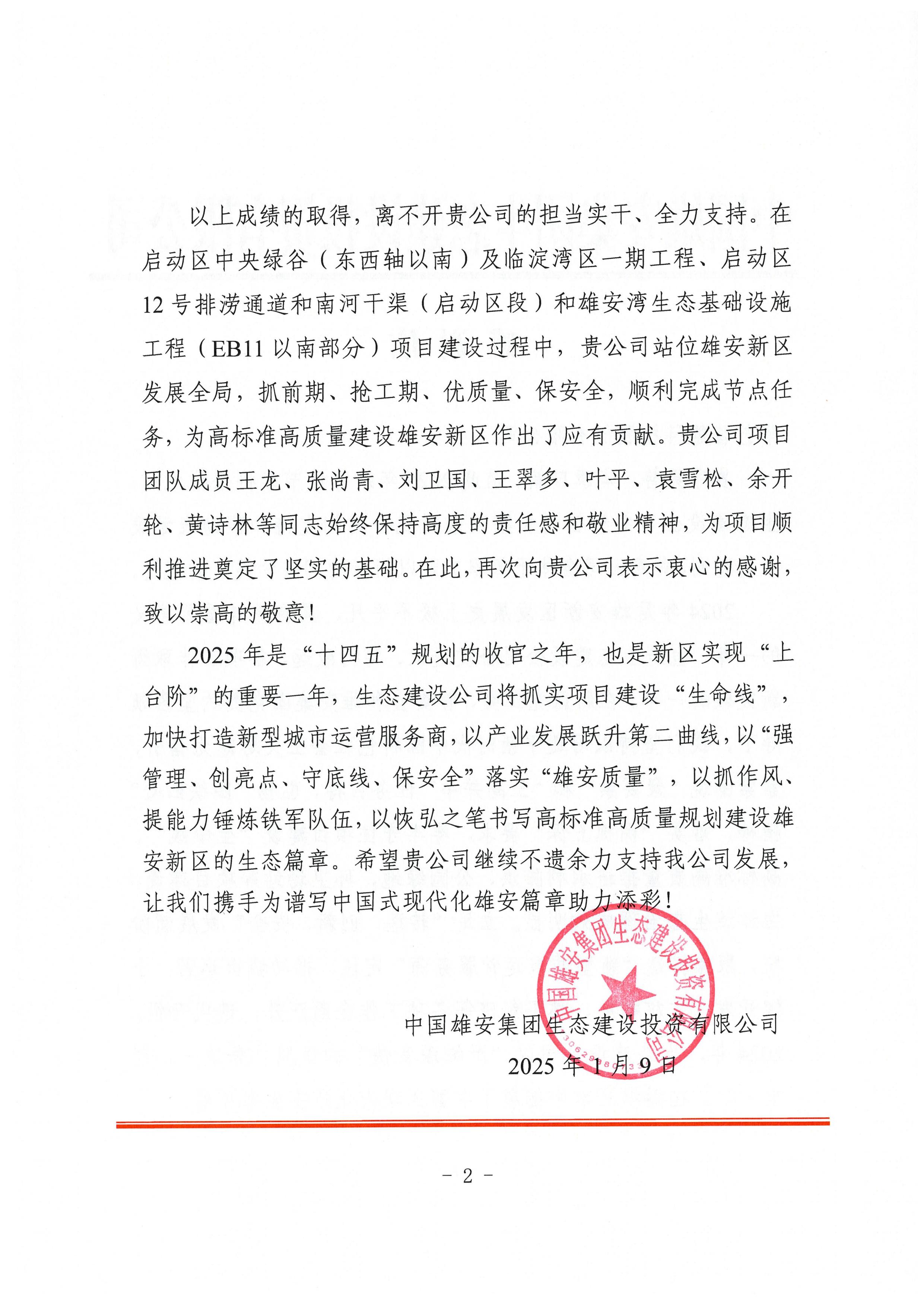 近日,華藝智慧科技股份有限公司收到來自中國雄安集團生態(tài)建設(shè)投資有限公司發(fā)來的一封感謝信,信中對華藝智慧在啟動區(qū)中央綠谷(東西軸以南)及臨淀灣區(qū)一期工程、啟動區(qū)12號排澇通道和南河千渠(啟動區(qū)段)和雄安灣生態(tài)基礎(chǔ)設(shè)施工程(EB11以南部分)項目營造中“強管理、創(chuàng)亮點、守底線、保安全”落實“雄安質(zhì)量”工作給予了高度評價,并對今后持續(xù)合作充滿信心和期待。