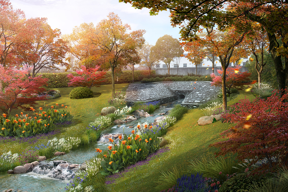 規(guī)劃設(shè)計后片植植物,打造氣勢感;注重色彩變化,打造不同季節(jié)的視覺感受。注重生態(tài)保護(hù),注重山水環(huán)境的打造。