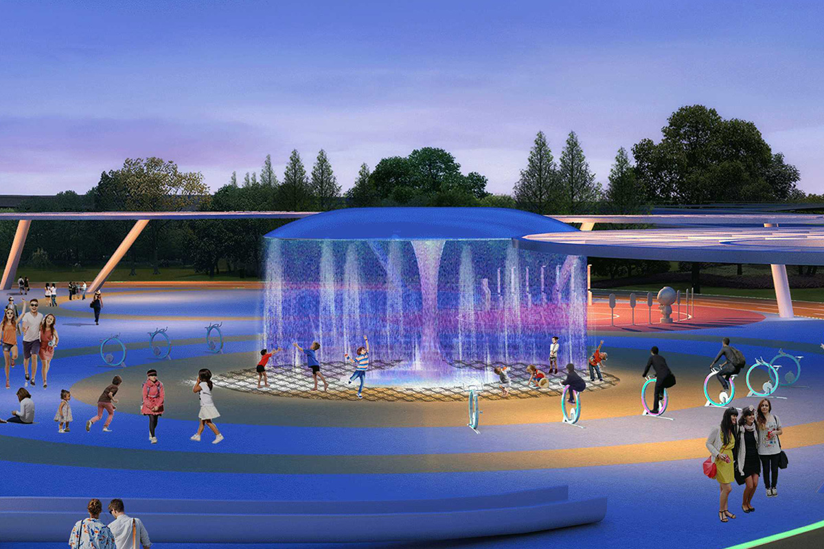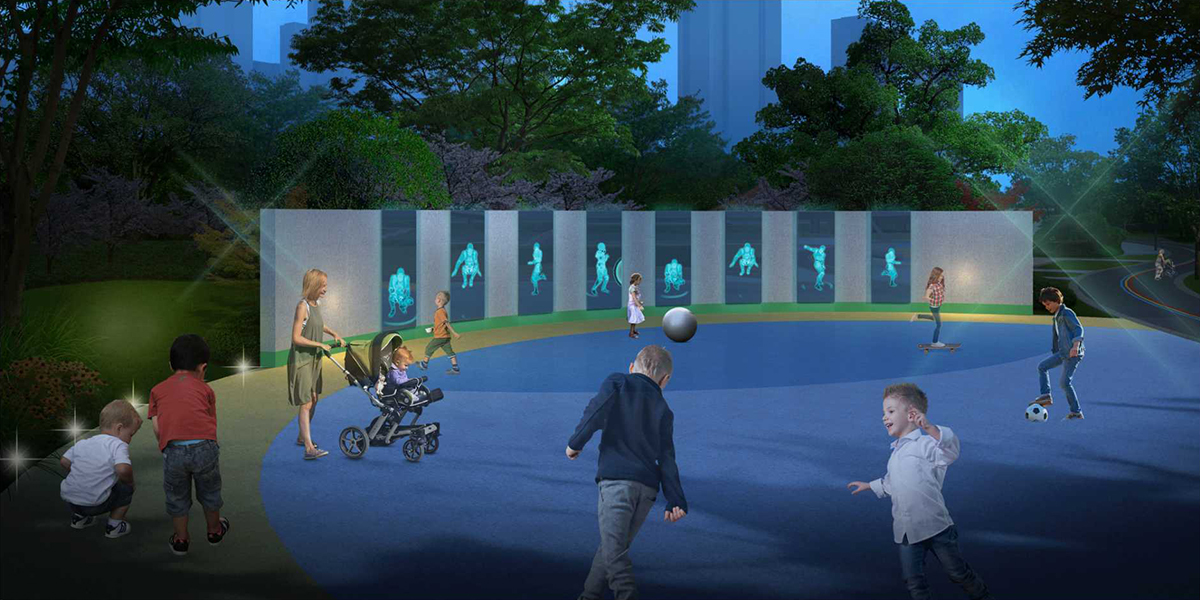 不僅有智慧化區(qū)也有無動力區(qū)。智慧化區(qū)以兒童虛擬嘉年華為主題設(shè)計(jì)了跳躍大賽-耐力大賽-協(xié)調(diào)大賽-AR切水果-冬奧跳跳賽-冬奧打雪仗、追光跑道、童心涌泉互動騎行、AI文化科普互動機(jī)器人、AI樂聲清揚(yáng)互動琴弦 、藍(lán)夾纈感應(yīng)門等智慧設(shè)備。